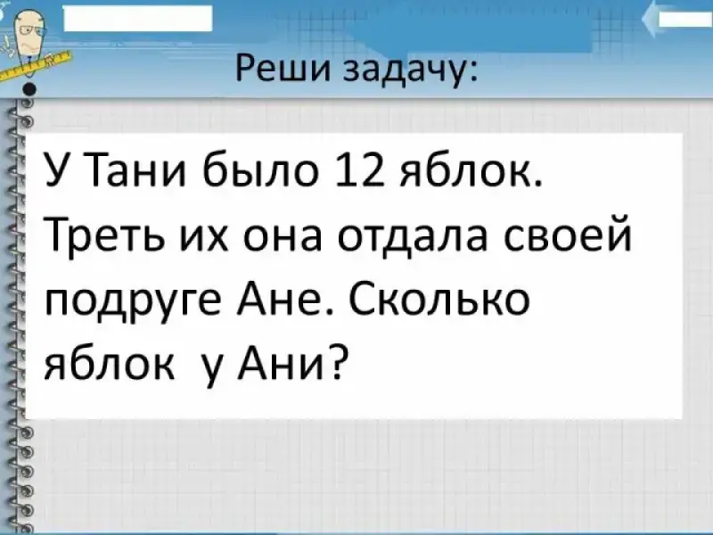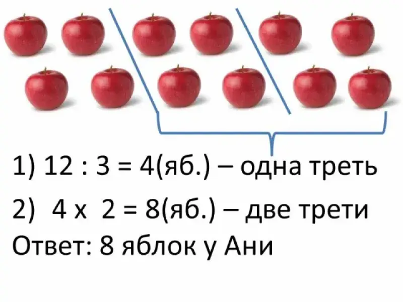 У Тани было 12 яблок. Треть их она отдала своей подруге Ане. Сколько яблок у Ани? - Как найти треть числа? - Как решить такую задачу? Решение: 12:3=4(яб.) Ответ: 4 яблока |