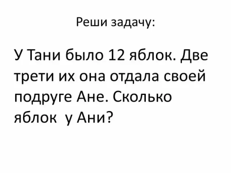 У Тани было 12 яблок. Две трети их она отдала своей подруге Ане. Сколько яблок у Ани? - Найдите, сколько яблок у Ани. - Почему возникла трудность? - Чему будем учиться сегодня на уроке? Учиться находить несколько долей числа. |
