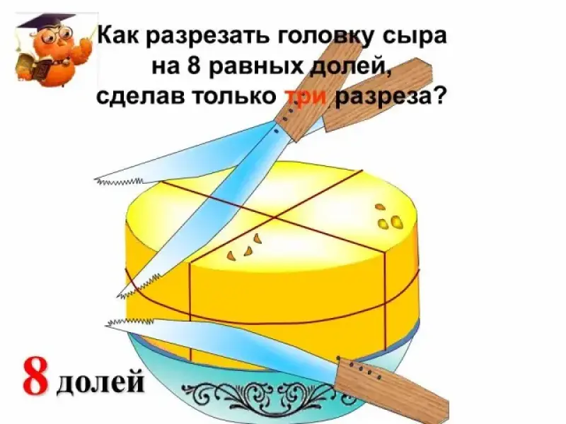 | 3. Задание на логику: тем, кто раньше справился с заданием: Как разрезать головку сыра на 8 равных долей, сделав только три разреза. | Развивают логическое мышление, решают ситуацию, связанную с жизнью. | ||||||||||||||