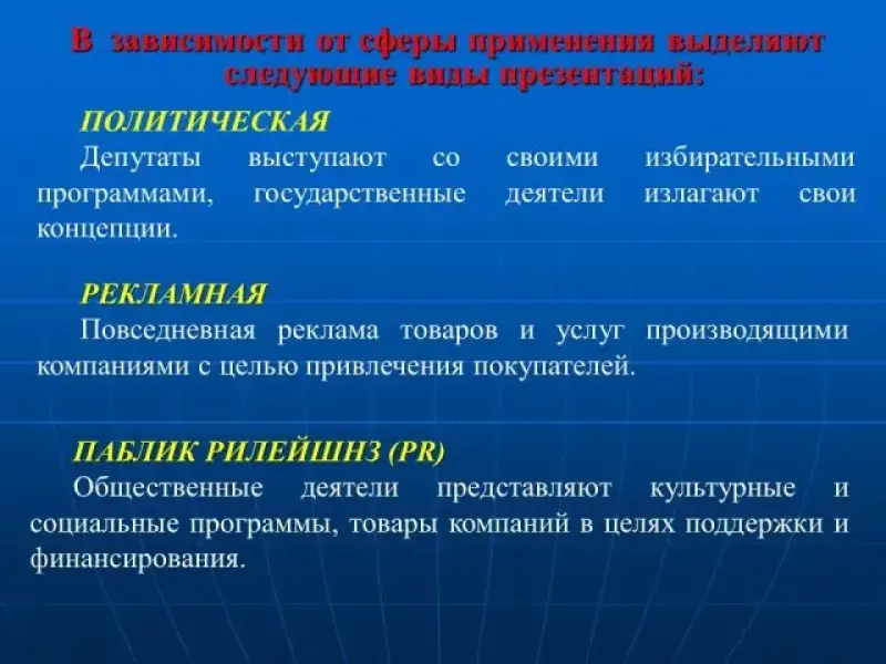 Учитель: Давайте рассмотрим следующие виды презентаций в зависимости от сферы применения запишите в тетради заголовок "Виды презентаций". Итак к в зависимости от сферы применения выделяют следующие виды презентаций (Презентация 1 слайд 4):