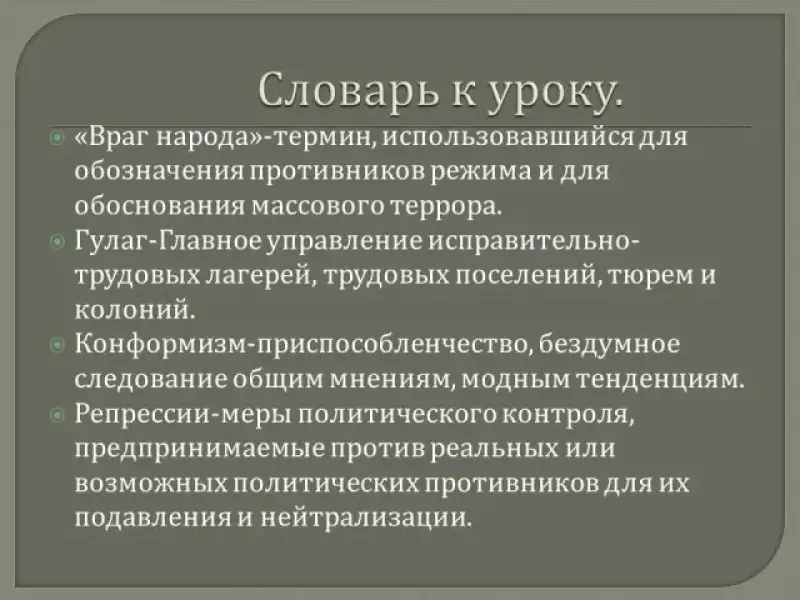 (Слайд 3) Лексическая работа: "враг народа", ГУЛАГ, конформизм, репрессии, репрессированный.