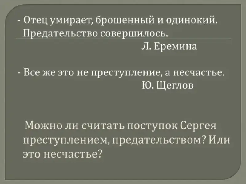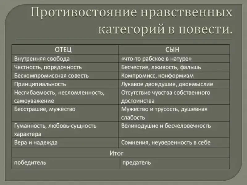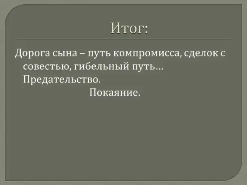 Как вы оцениваете этот поступок? Что же заставляет человека поступиться личными удобствами, реальными, ощутимыми? Он не сумел в духовном плане встать вровень с отцом, с его нравственной нормой. Если путь отца - это духовно-нравственное восхождение, то путь сына - это гибельный путь. Путь сделок с совестью, путь уступок самому себе, путь уничтожения в себе человека.