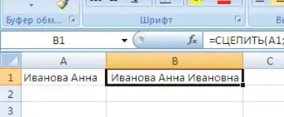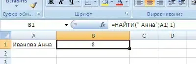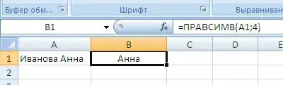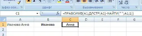 - Как выделить имя? Похожим способом, только справа. Также найдем позицию пробела, но теперь нужно из длины строки вычесть позицию пробела и получим количество символов в имени: ДЛСТР(А1)-НАЙТИ(" "; А1;1)