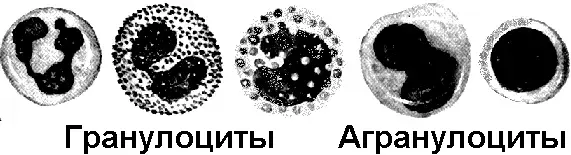 Образуются в красном костном мозге, лимфатических узлах, селезенке. Разрушаются в селезенке. Живут до 20 суток, клетки иммунологической памяти - десятки лет. В зависимости от зернистости цитоплазмы делятся на гранулоциты и агранулоциты (рис. 195).