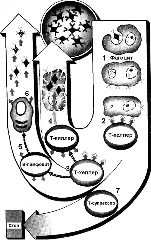 Под действием этих веществ, -лимфоциты превращаются в плазматические клетки и выделяют до 2000 антител в секунду. Антитела связываются с антигенами, затем происходит уничтожение чужеродных тел. Т-киллеры уничтожают и возбудителей, и собственные клетки, на поверхности которых находятся антигены проникших в клетку возбудителей. Т-супрессоры прекращают иммунный ответ после того, как организм справился с инфекцией.