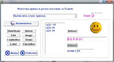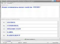 Повторение названий, свойств и событий компонентов среды программирования Delphi. Данная тестовая программа универсальна в том, что задания можно составить в самых различных вариантах - кроме стандартного одиночного выбора ответа множественный выбор, сопоставление компонента его свойству, указание порядка действий или последовательности, перестановка букв, составляющих слово ответа, ввод ответа вручную с клавиатуры, и т.д.