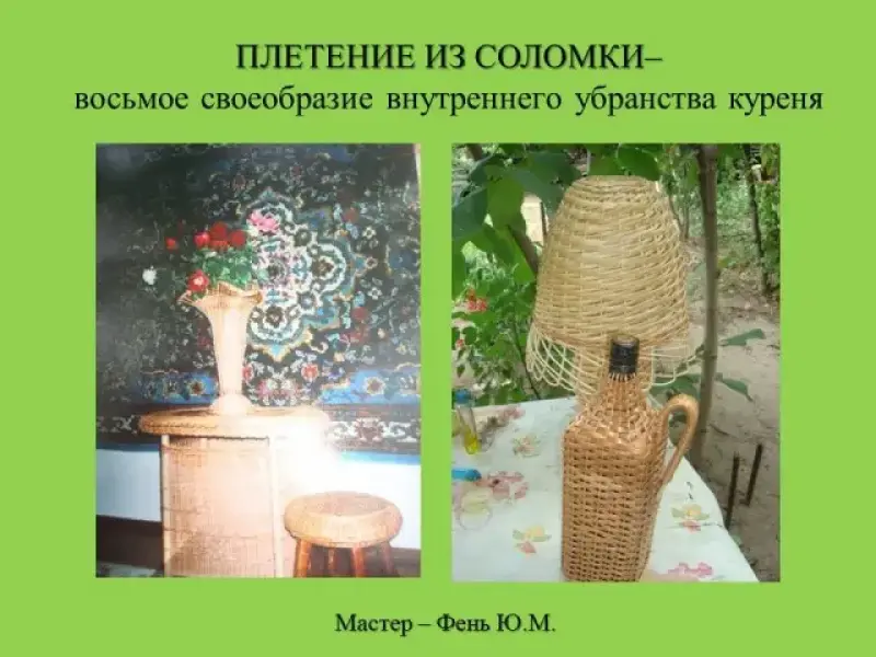 Донской курень исстари славится плетеными украшениями. Материал для плетения каждый мастер выбирает свой: камыш, лозу, бересту, соломку. Опрос жителей показал, что станичники любят вешать на стены фотографии родных в плетеных из лозы рамочках. Многочисленные документы и письма свидетельствуют, что на Дону всегда высоко ценились различные плетеные шкатулки и коробочки для писем и ценных бумаг, наград и украшений. Изящные шкатулки тонкого ажурного плетения ставили на красивые кружевные салфетки, и в курене им отводились самые почетные места.