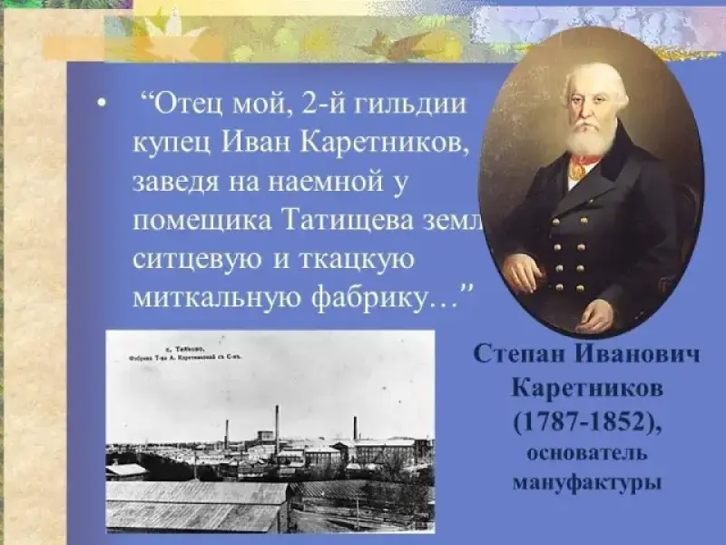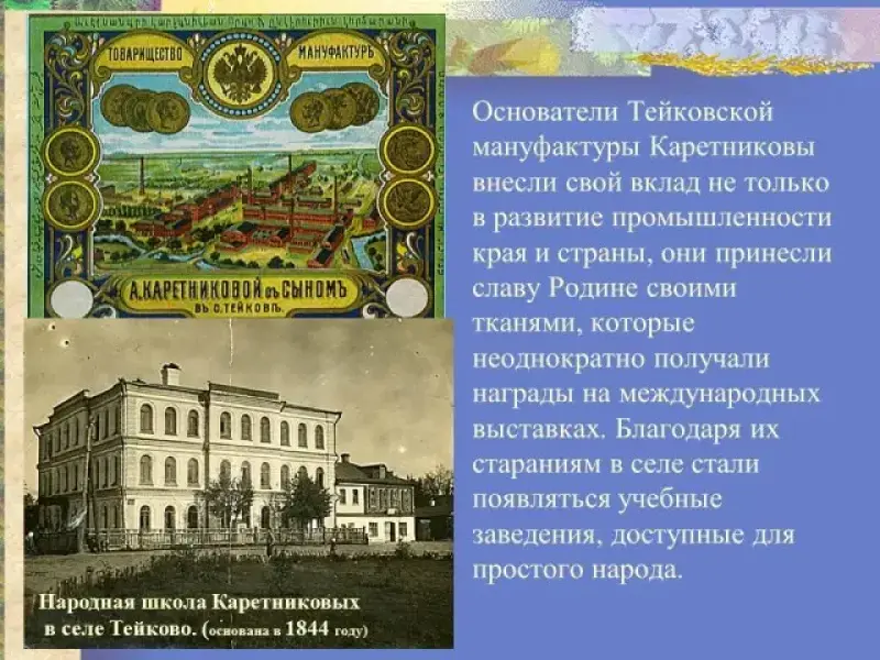 Основатели Тейковской мануфактуры Каретниковы внесли свой вклад не только в развитие промышленности края и страны, они принесли славу Родине своими тканями, которые неоднократно получали награды на международных выставках. Это были люди, которые заботились не только о своих доходах, но и о нуждах села. Благодаря их стараниям в селе стали появляться учебные заведения, доступные для простого народа.