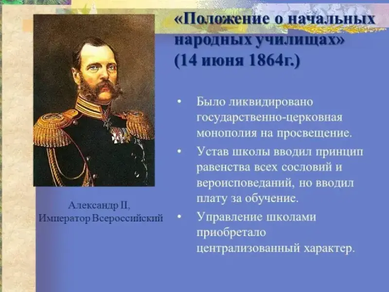 Переломным моментом в истории российской школы была реформа 1860-х гг., подготовленная педагогами и общественными деятелями (Н. И. Пирогов, А. Г. Ободовский, В. Ф. Одоевский, П. Г. Редкин, К. Д. Ушинский и др.). По "Положению о начальных народных училищах" (1864) и "Уставу гимназий и прогимназий" (1864) все школы провозглашались общедоступными и всесословными, однако, в отношении гимназий этот принцип не соблюдался. Цель начального образования определялась как "утверждение в народе религиозных и нравственных понятий и распространение первоначальных полезных знаний".2 Поощрялась частная и земская инициатива в открытии учебных заведений. Росло число начальных и средних общеобразовательных учебных заведений (в 1856-80гг. - с 8,2 тыс. до 22,7 тыс., учащихся в них - с 450 тыс. до 1141 тыс.).3 Управление школами приобретало централизованный характер.