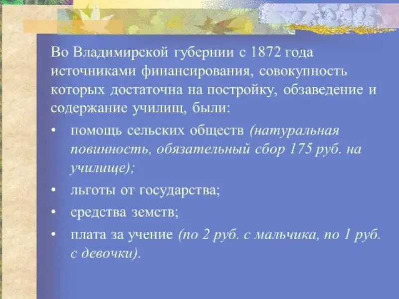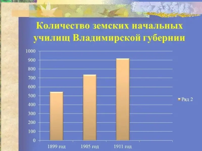 В конце 1860 - 1870-х гг. развернулась деятельность земств в области народного образования (в 1869г. в земских губерниях было 9677 школ с 274 тыс. учащихся, в 1874 - 16 310 школ с 759 тыс. учащихся). Расходы на образование увеличились с 5% земского бюджета в 1868г. до 10,3% в 1873г. В 1880г. доля общественного участия в содержании начальных школ возросла до 86,1% общих затрат.4 Основными чертами земской школы были трехлетний курс обучения и один учитель, занимающийся с тремя отделениями. До 1891г. в земской школе отсутствовали твердо установленные программы, учитель был свободен в выборе методов обучения и учебников. Земство обеспечивало учителя денежным содержанием, а школу учебными пособиями. Крестьяне содействовали содержанию школьного помещения.