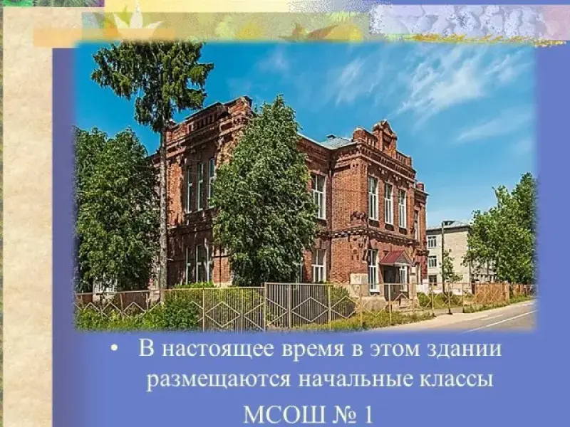 В действующей земской школе (здание начальных классов) было открыто 2-х классное министерское училище. Она вполне обеспечивала конторско-счетными кадрами фабрику Каретникова. Официальное ее название - народное училище ведомства Министерства народного просвещения. На фронтоне видна надпись: "В память 19 февраля 1861 года".