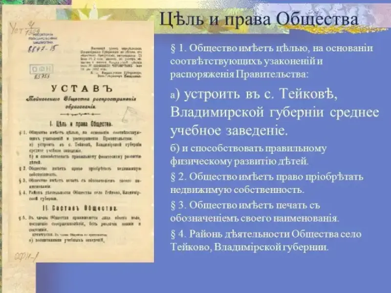 а) устроить въ с. Тейков?, Владимирской губерніи среднее учебное заведеніе."10