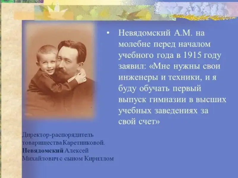 Невядомский А.М. на молебне перед началом учебного года в 1915 году заявил: "Мне нужны свои инженеры и техники, и я буду обучать первый выпуск гимназии в высших учебных заведениях за свой счет".11