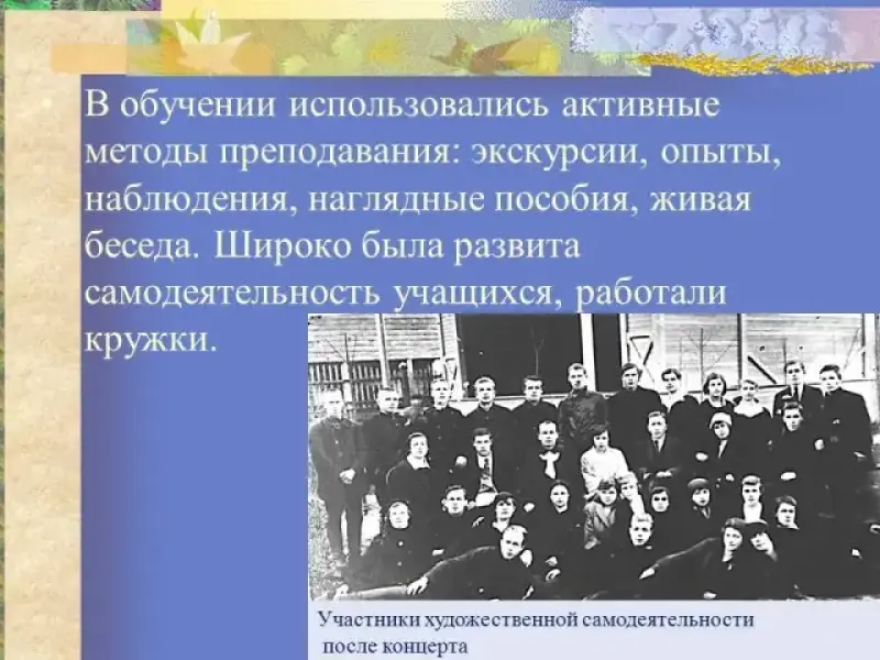 В обучении использовались активные методы преподавания: экскурсии, опыты, наблюдения, наглядные пособия, живая беседа. Широко была развита самодеятельность учащихся, работали кружки. Руководителями самодеятельности были учителя или представители фабричной интеллигенции. Часто проводились организованные дни отдыха, 2-3 раза в году проводились родительские собрания.