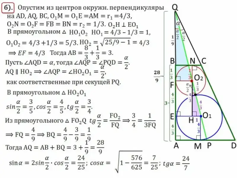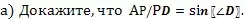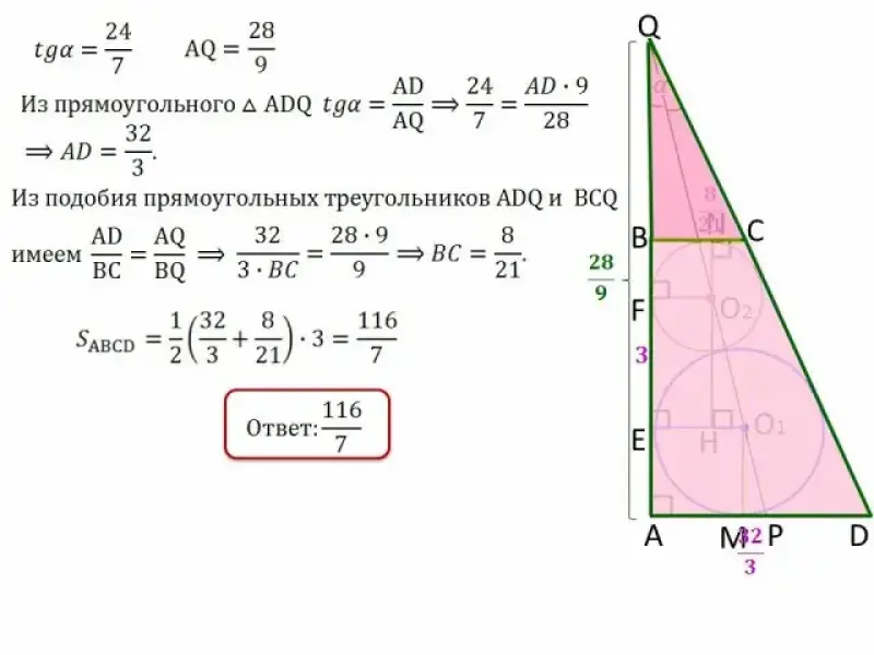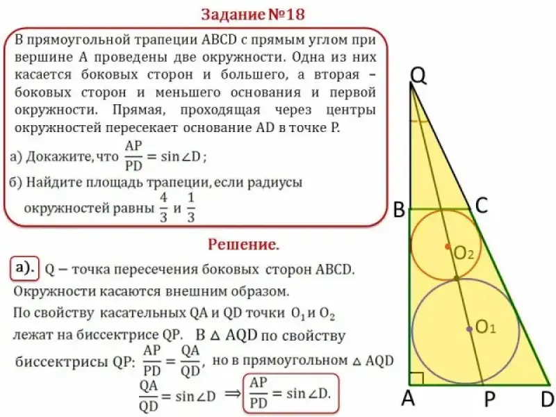 В прямоугольной трапеции ABCD с прямым углом при вершине А проведены две окружности. Одна из них касается боковых сторон и большего, а вторая - боковых сторон и меньшего основания и первой окружности. Прямая, проходящая через центры окружностей пересекает основание AD в точке Р.