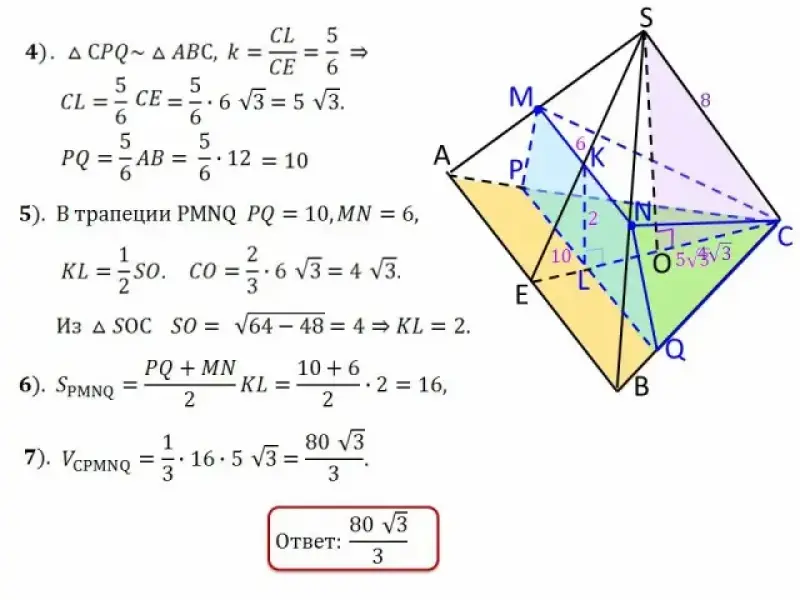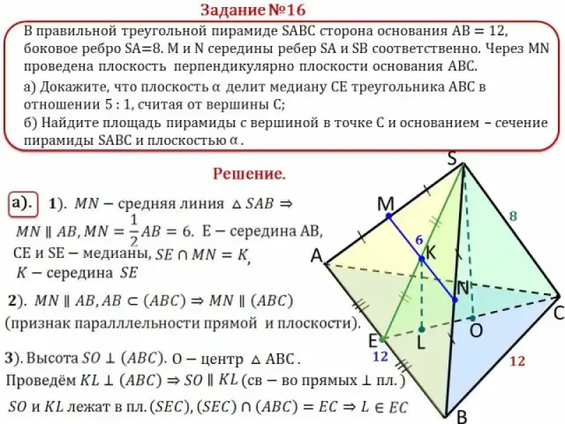В правильной треугольной пирамиде SABC сторона основания АВ = 12, боковое ребро SA = 8. M и N середины ребер SA и SB соответственно. Через MN проведена плоскость