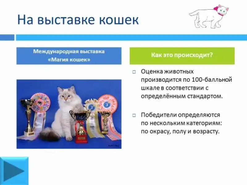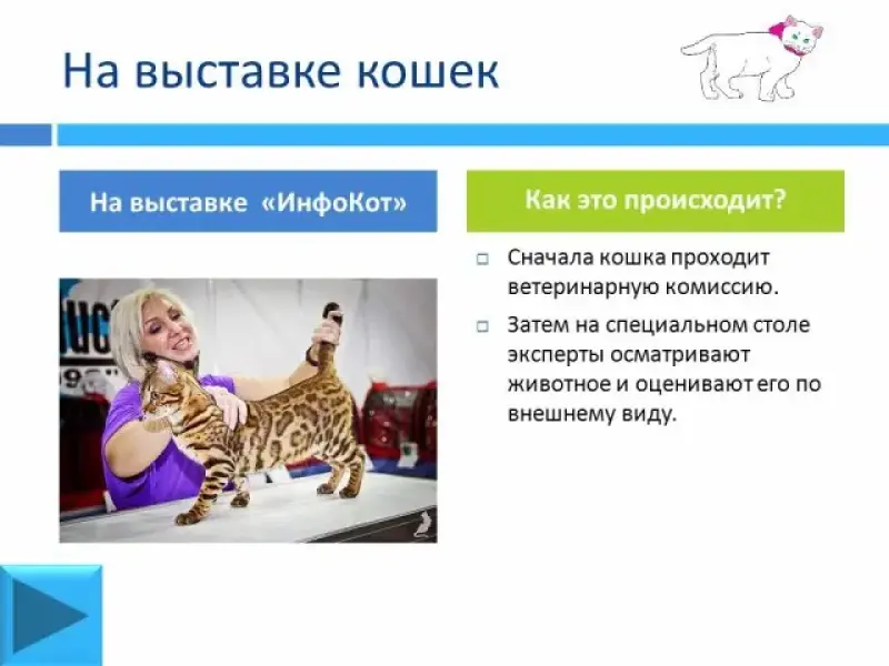 На выставки представляются кошки, получившие оценки "очень хорошо" или "отлично" на предварительных осмотрах. Вначале кошка проходит ветеринарную комиссию. Затем животное осматривают на специальном столе. Эксперты оценивают кошек по их внешнему виду. Поэтому обычно кошачьи выставки проходят в холодное время. Почему? (Шерсть животных начинает расти и выглядит наиболее привлекательно.)