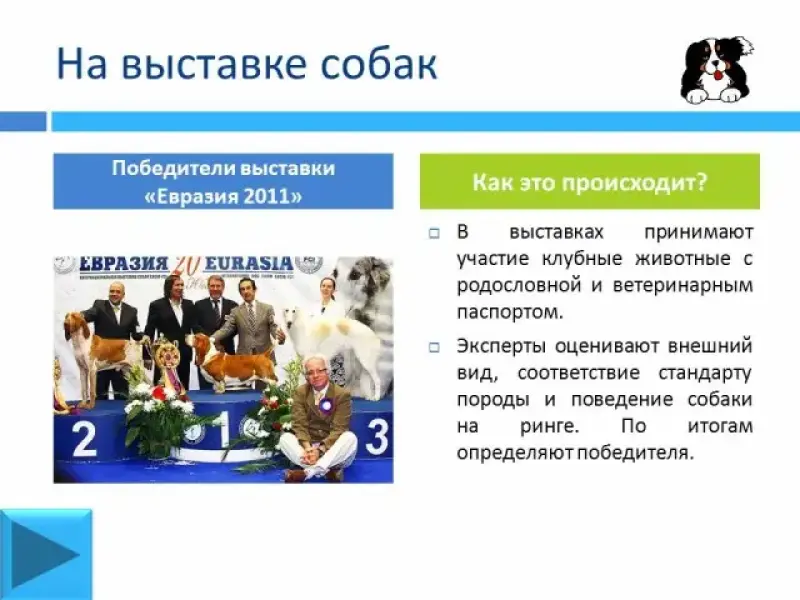 В выставках собак принимают участие животные с родословной и ветеринарным паспортом, стоящие на учёте в клубе. Для того чтобы собака на выставке смогла составить конкуренцию другим, она должна находиться в своей лучшей (выставочной) форме и уметь правильно вести себя на ринге. Наивысшим титулом, который собака может получить на выставке, является титул "Чемпион мира". Эксперты оценивают внешний вид собаки, соответствие стандарту породы, поведение животного на ринге и по итогам определяют победителя.