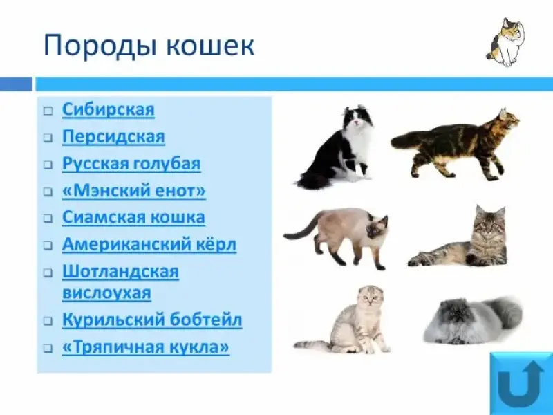 У. Породы кошек принято делить на длинношёрстные, короткошёрстные и голые. Каждая порода имеет свои особенности. Домашние кошки - общее название беспородных кошек. Став ручными, они не потеряли своё главное кошачье качество - независимость. На Руси кошка считалась хранительницей домашнего очага, её первой пускали в новое жилище "на счастье".