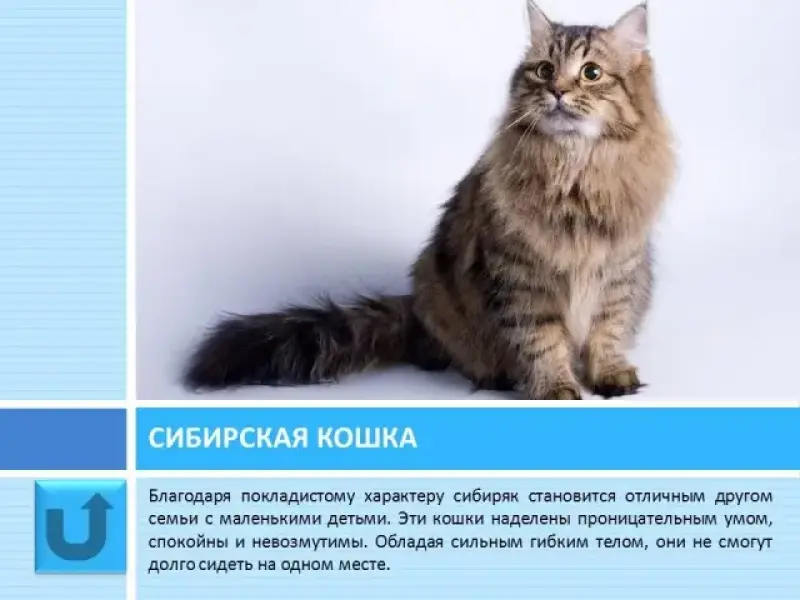 Слайд 10 "Сибирскими" в России традиционно называли всех больших и пушистых кошек. Они издавна ценились за ласковый преданный характер, проницательный ум и за умение ловить мышей. Благодаря покладистому характеру сибиряк станет отличным другом семьи с маленькими детьми. Среди всех видов кошачьих только сибиряк способен откликаться на своё прозвище. Этот домашний любимец нуждается в пространстве.