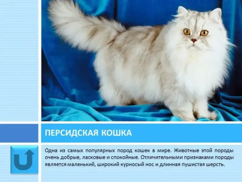 Слайд 11 Персидская кошка - это одна из самых популярных пород кошек в мире. Представители этой породы являются милыми существами, одно из которых может стать вашим лучшим компаньоном и всегда поднимать ваше настроение. Особенным отличительным признаком персидской породы кошек является маленький, широкий и курносый нос.