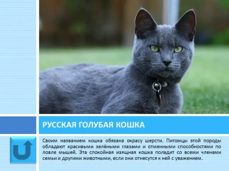Слайд 12 Своим названием русская голубая кошка обязана окрасу шерсти. Питомцы этой породы обладают зелёными глазами и отменными способностями по ловле мышей. Эта спокойная изящная кошка поладит со всеми членами семьи и другими животными, если они отнесутся к ней с уважением.