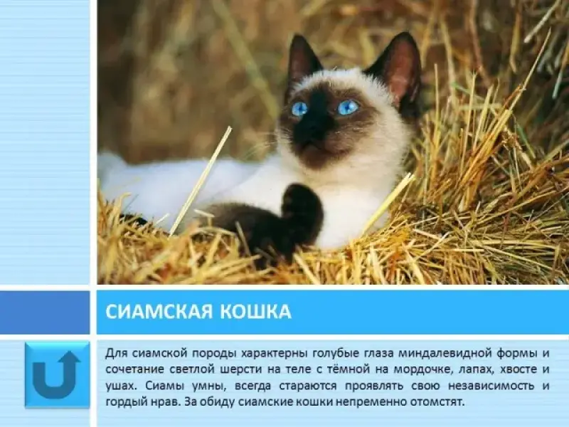 Слайд 14 Сиамские - короткошёрстные кошки с утонченными формами тела. Главные признаки породы - голубые глаза миндалевидной формы и характерный окрас - сочетание светлой шерсти на теле с тёмной на мордочке, лапах, хвосте и ушах. Эта порода достаточно непредсказуема. Сиамы ненавидят, когда их тискают, но любят постоянно быть в компании хозяина. Если обидеть сиамскую кошку, то она непременно отомстит. Сиамские - одни из самых высокоинтеллектуальных кошек. Они умны и сообразительны. Эта порода хорошо поддается дрессировке, если быть терпеливым, кота можно научить разным трюкам.