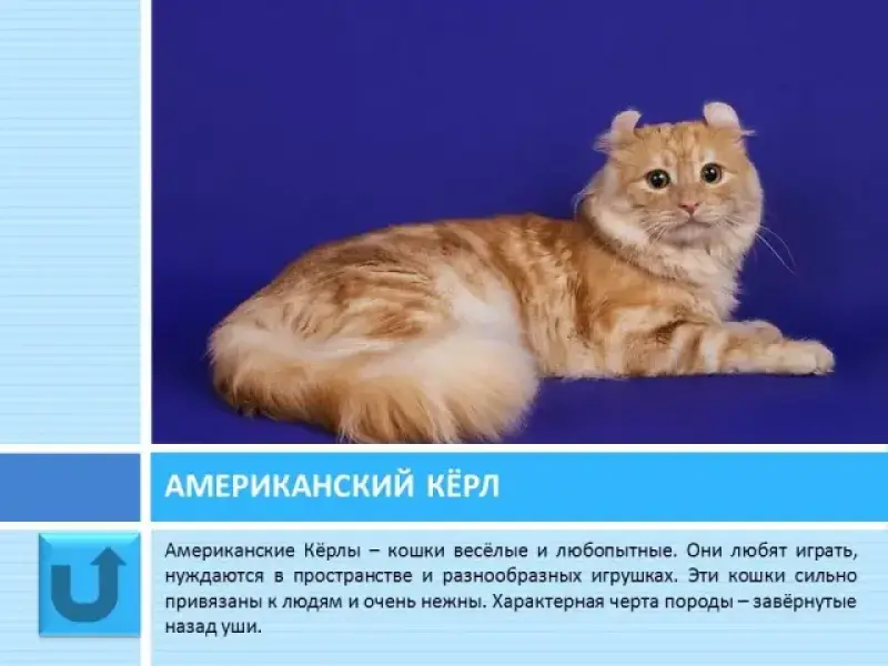 Слайд 15 Американский кёрл - это интеллигентная, дружелюбная и игривая кошка. Она нуждается в пространстве и разнообразных игрушках. Эти животные уравновешенные и ласковые, ищут человеческое общество и прикосновение хозяйских рук, не переносят одиночество и прекрасно уживаются со всеми членами семьи и животными. Характерная черта породы - завёрнутые назад уши.