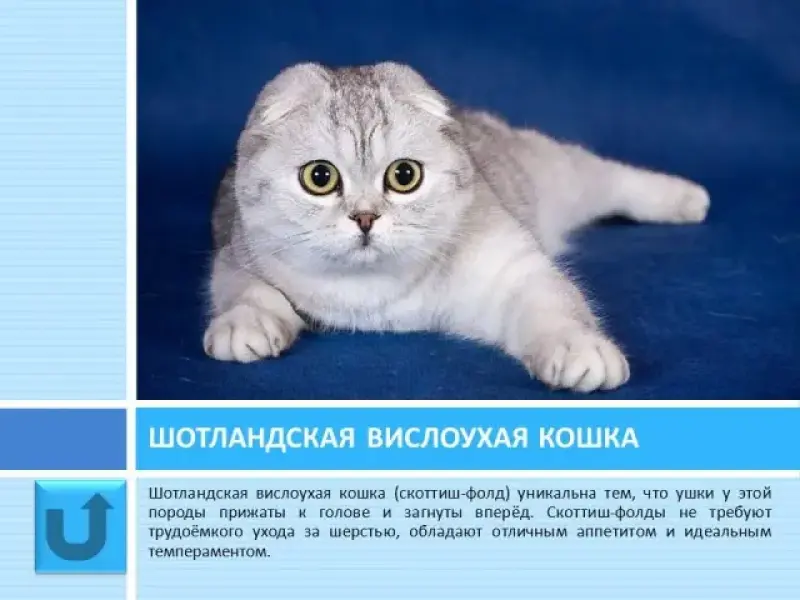 Слайд 16 Шотландская вислоухая кошка уникальна тем, что ушки у этой породы прижаты к голове и загнуты вперёд. Скоттиш-фолды не требуют трудоёмкого ухода за шерстью, обладают отличным аппетитом и идеальным темпераментом.