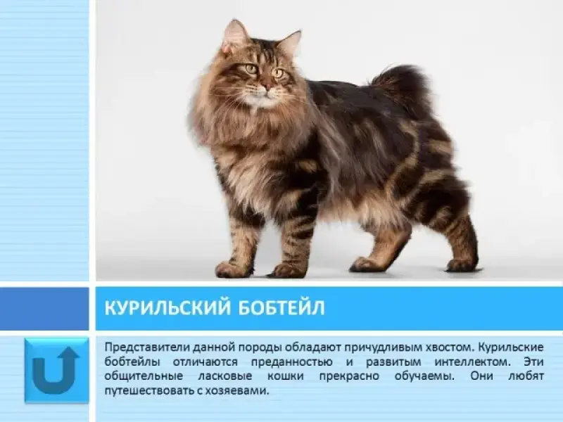 Слайд 17 Курильские бобтейлы обладают причудливым хвостом. Представители данной породы отличается преданностью, развитым интеллектом и охотничьими навыками. Они прекрасно обучаемы, ласковые и общительные. Курильский бобтейл - настоящий путешественник. Некоторые владельцы приучают таких кошек с детства к походам.