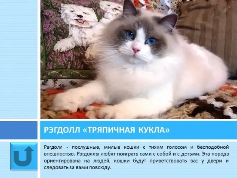 Слайд 18 Рэгдолл - послушные, милые и игривые кошки с тихим голосом. Они любят поиграть сами с собой и с детьми. Эта порода ориентирована на людей, кошки будут приветствовать вас у двери и следовать за вами повсюду. "Рэгдолл" с английского переводится как "тряпичная кукла". Порода получила своё название из-за уникальной особенности таких кошек: если взять их на руки, то они полностью расслабляются, словно большая мягкая игрушка.