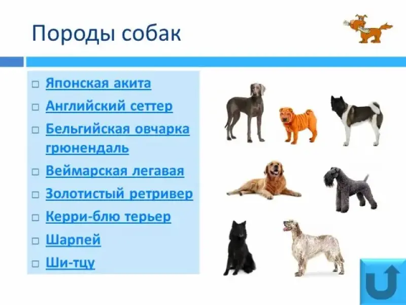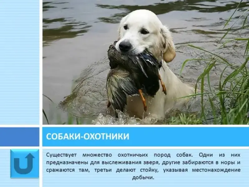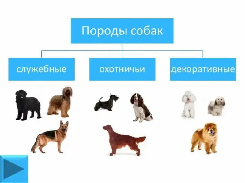 У. Породы собак делятся на три большие группы: служебные, охотничьи, декоративные.