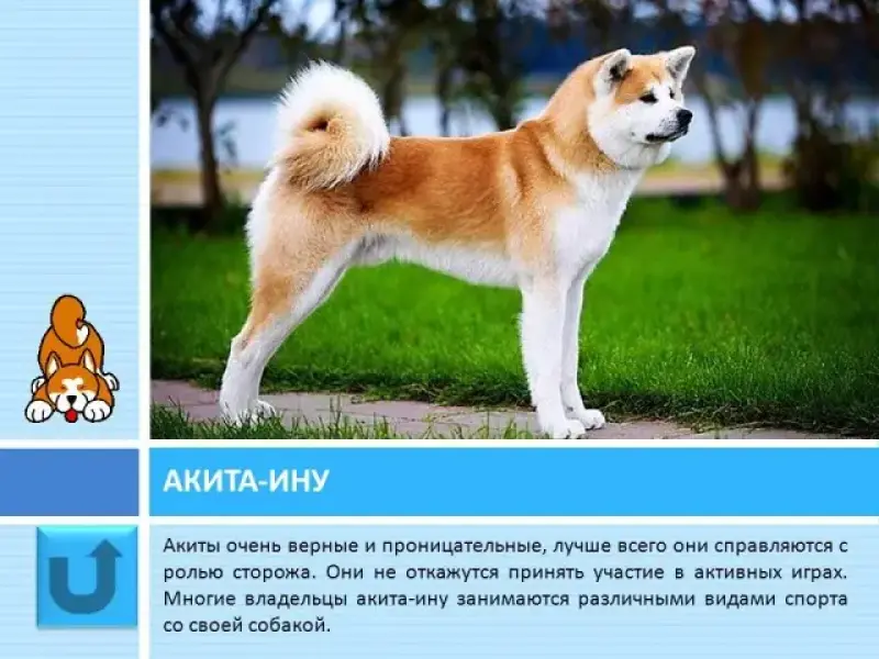 Слайд 21 Акита-ину ? порода собак, выведенная в провинции Акита в Японии. Долгое время собаки использовались для охоты на кабанов, оленей и медведей. Акиты очень верные и проницательные, лучше всего они справляются с ролью сторожа. Многие владельцы акита-ину занимаются различными видами спорта вместе со своей собакой.