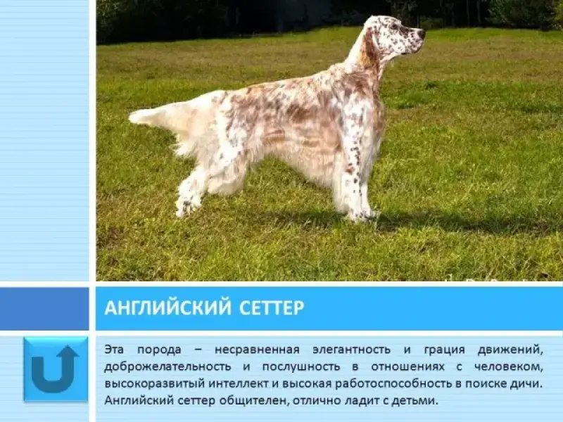 Слайд 22 Английский сеттер - элегантная красивая охотничья собака. Особенностью породы является необычный крапчатый окрас. Собаки этой породы преданы всем домочадцам, особенно благосклонны к хозяину и детям. Это самый послушный из всех видов сеттеров, легко поддаётся дрессировке, энергичен, любит забавы.