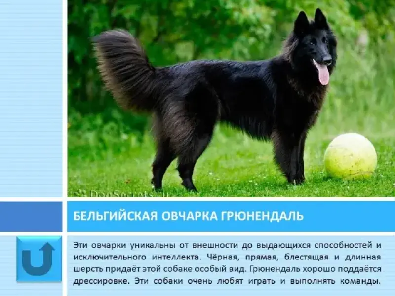 Слайд 23 На своей родине бельгийская овчарка грюнендаль использовалась в роли пастуха и охранника. Чёрная блестящая длинная шерсть придаёт этой собаке особый вид. Эти собаки уникальны своими выдающимися способностями и исключительным интеллектом. Грюнендаль отличается преданностью, скоростью, выносливостью и силой, хорошо поддаётся дрессировке. Эти овчарки любят играть и выполнять разные команды.