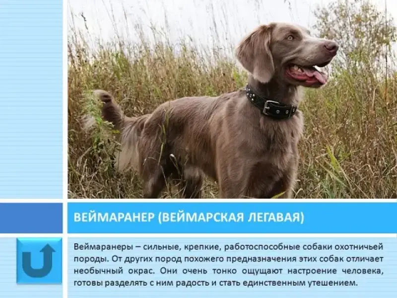 Слайд 24 Веймаранер - это охотничья порода собак, относящаяся к группе легавых, они же подружейные. От других этих собак отличает серебристо-серый окрас. Веймаранеры - сильные, крепкие, работоспособные собаки. Они очень тонко ощущают настроение человека, готовы разделять с ним радость и стать единственным утешением.