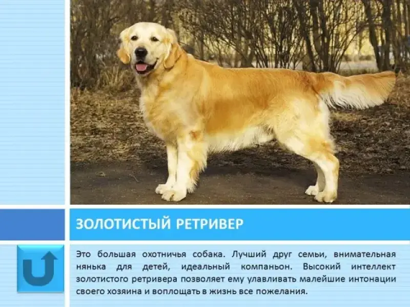 Это лучший друг семьи, внимательная нянька для детей и идеальный компаньон. Высокий интеллект этой собаки позволяет ей улавливать малейшие интонации своего хозяина. Ретривер отлично ладит с детьми всех возрастов и может стать прекрасным помощником для инвалида или поводырём для незрячего. Ретриверы бывают кремового, бледно-золотистого и золотистого окраса.
