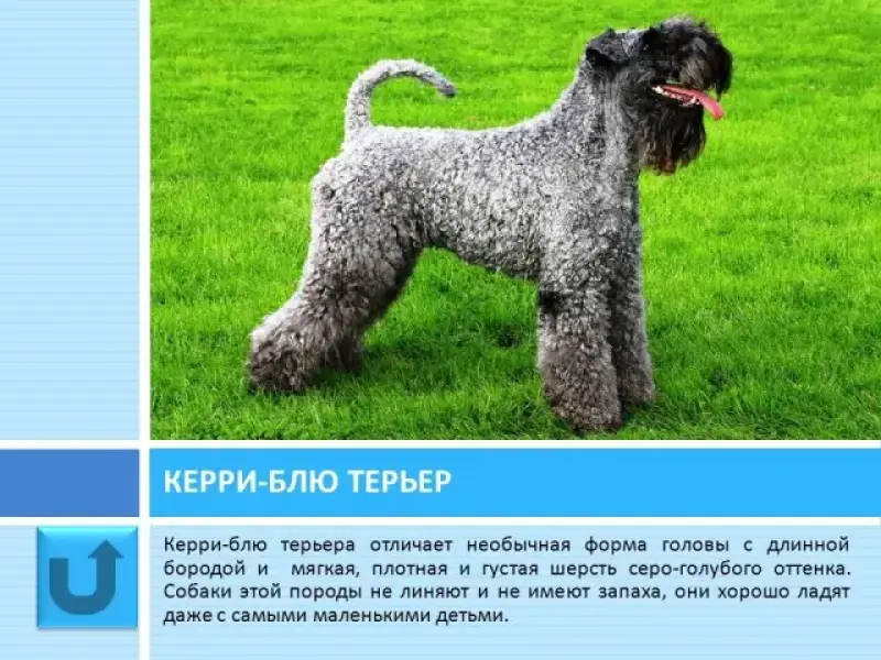 Слайд 26 Керри-блю-терьера отличает необычная форма головы с длинной бородой и густая шерсть серо-голубого оттенка. В графстве Керри (в Ирландии) керри-блю-терьера использовали для охоты на барсука, лису и выдру, в качестве пастуха овечьих отар и как сторожевого пса. Керри - хороший пловец, сторож, охотник и крысолов. В наше время керри стал национальным символом Ирландии. Собаки этой породы не линяют и не имеют запаха. Они хорошо ладят даже с самыми маленькими детьми.