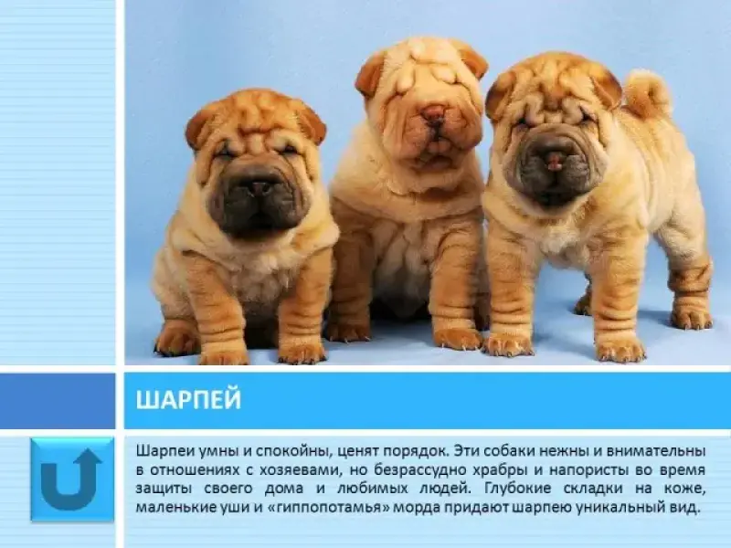 Слайд 27 Шарпей ? порода сторожевых и охотничьих собак родом из Китая. Шарпеи умны, спокойны и ценят порядок. Они нежны в отношениях с хозяевами, но безрассудно храбры во время защиты своего дома и любимых людей. Пёс готов терпеливо ждать возвращения хозяев, будучи при этом всегда на чеку (даже во сне). Глубокие складки на коже, маленькие уши и "гиппопотамья" морда придают шарпею уникальный вид.