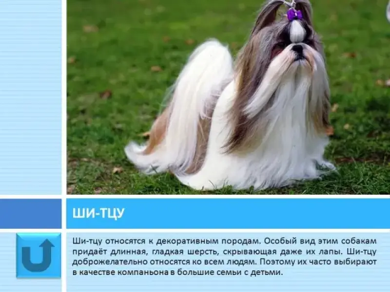 Слайд 28 Ши-тцу относятся к декоративным породам. У них обаятельная, необычная внешность. Особый вид этим собакам придает длинная шерсть, полностью скрывающая даже их лапы. Они преданные и любвеобильные, доброжелательно относятся ко всем людям. Поэтому их часто выбирают в качестве компаньона в большие семьи с детьми.