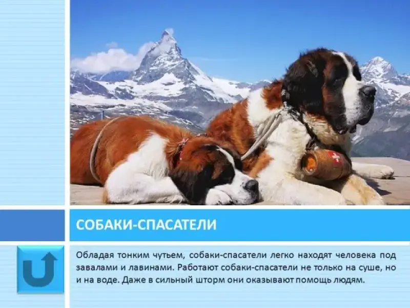 Слайды 29, 30 Профессии собак. Собаки-спасатели. Обладая тонким чутьем, собаки-спасатели легко находят человека под завалами и лавинами. Работают собаки - спасатели не только на суше, но и на воде. Даже в сильный шторм они оказывают помощь людям.