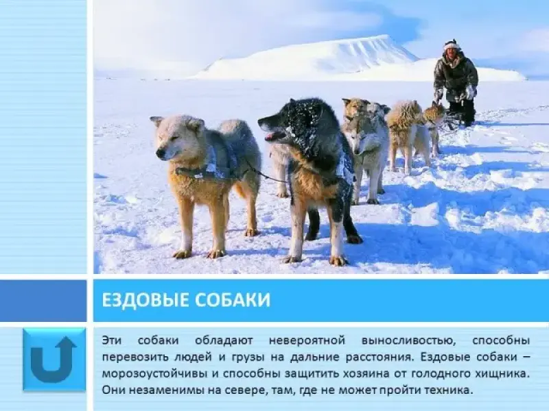 Слайд 31 Ездовые собаки. Эти собаки, обладая невероятной выносливостью, способны перевозить людей и грузы на дальние расстояния. За день собаки способны перемещаться на расстояние до 80 км по глубокому снегу, с грузом и ездоком. Ездовые собаки должны быть морозоустойчивыми и суметь защитить хозяина при встрече с голодным хищником. Эти собаки незаменимы на севере, там, где не может пройти техника.