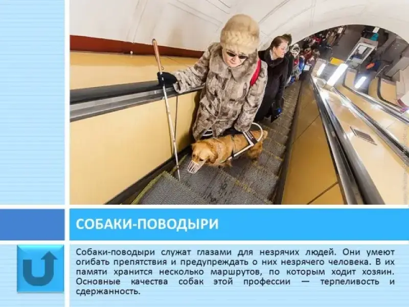 Слайд 33 Собаки - поводыри. Собаки - поводыри - служат глазами для незрячих людей. Собака-поводырь умеет огибать препятствия и предупреждать о них незрячего человека. В её памяти может сохраниться несколько маршрутов, по которым ходит хозяин. Она поднимет и подаст случайно упавший из рук хозяина предмет. Основные качества собак этой профессии - терпеливость и сдержанность.