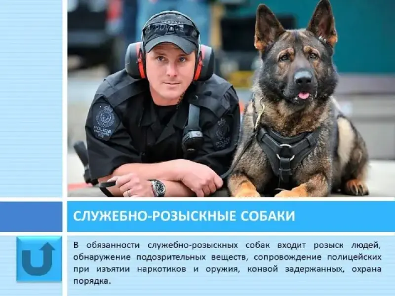Слайд 34 Служебно-розыскные собаки. В обязанности служебно-розыскных собак входит розыск людей, обнаружение подозрительных веществ, сопровождение полицейских при изъятии наркотиков и оружия, конвой задержанных, охрана порядка. В этой работе используются исключительный нюх и добросовестность собаки.