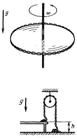 Задача 8. Цепь с неупругими звеньями перекинута через блок, причем часть ее лежит на столе, а часть - на полу. После того как цепь отпустили, она начала двигаться. Найдите скорость установившегося равномерного движения цепи. Высота стола h. [1]