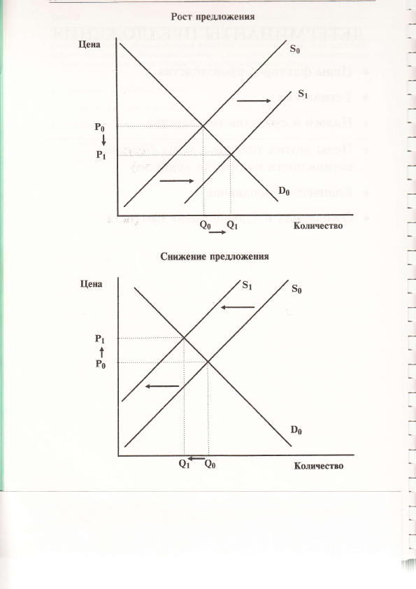 Показать слайд демонстрационного материала (ПРИЛОЖЕНИЕ 4) и объяснить, используя примеры, шесть детерминант предложения. Подчеркнуть, что первые три детерминанты связаны с затратами на то, чтобы сделать продукт доступным. Необходимо использовать демонстрационный материал (ПРИЛОЖЕНИЕ 5) для иллюстрации того, к каким последствиям приводит изменения каждой детерминанты. При этом важно обратить внимание учащихся на изменение равновесной цены и равновесного количества.