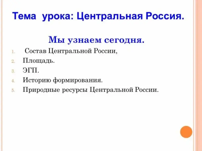 Мы продолжаем изучение экономического районирования. Тема нашего урока Центральная Россия. Мы узнаем сегодня: состав Центральной России, площадь, ЭГП, историю формирования, природные ресурсы Центральной России