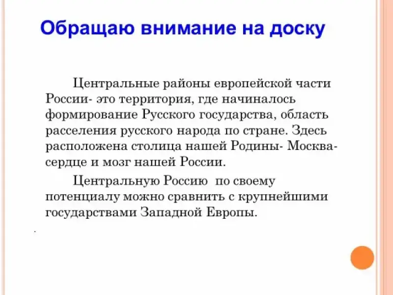 На доске текст: Центральные районы европейской части России - это территория, где начиналось формирование Русского государства, область расселения русского народа по стране. Здесь расположена столица нашей Родины - Москва - сердце и мозг нашей России. Центральную Россию по своему потенциалу можно сравнить с крупнейшими государствами Западной Европы. (слайд 4)