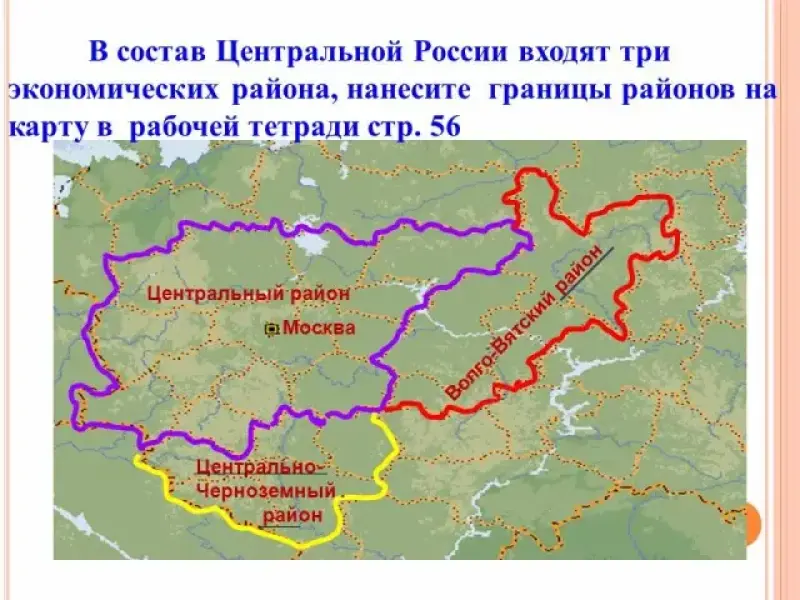 В состав Центральной России входят три экономических района и город федерального значения. Посмотрите на карту (слайды 6,7,8) назовите эти районы и нанесите их границы на карту в рабочей тетради стр.56 (4 минуты)