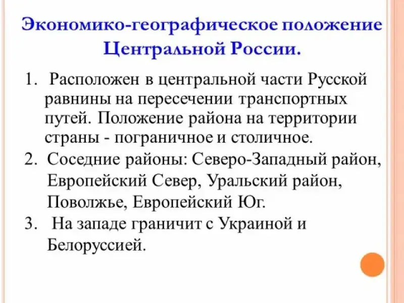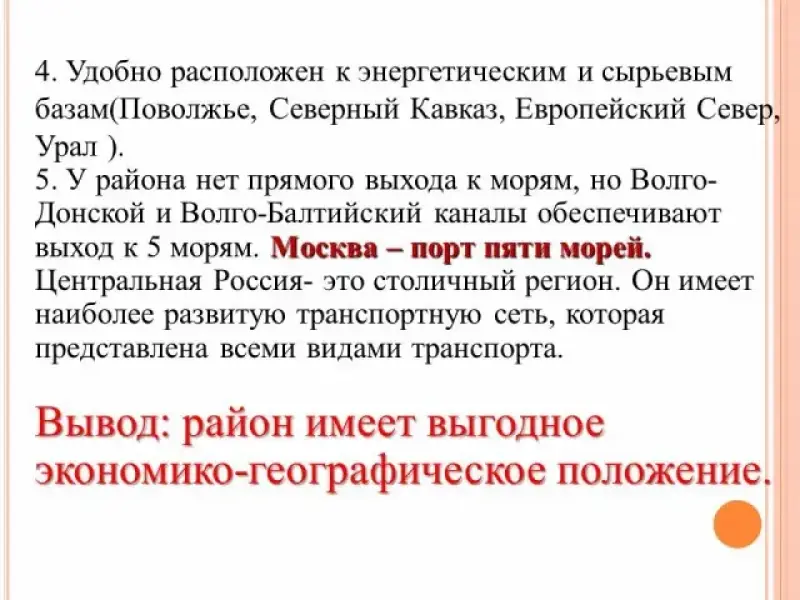 - Развитию экономики Центральной России благоприятствуют ЭГП.